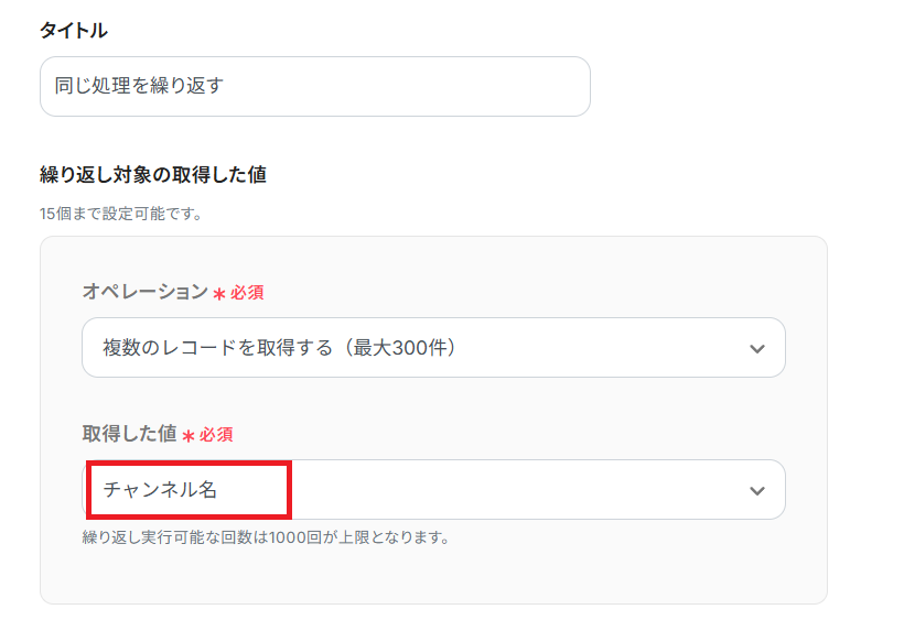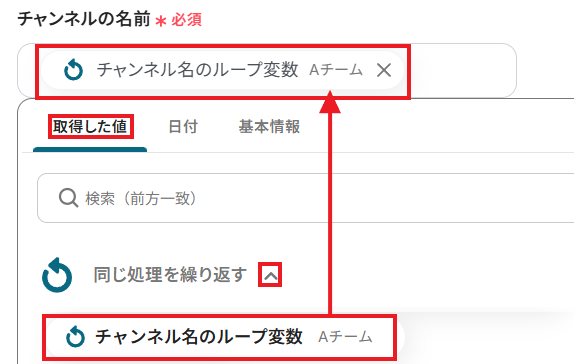 「チャンネルの名前」には、繰り返し処理の対象となっている取得した値を活用しましょう。