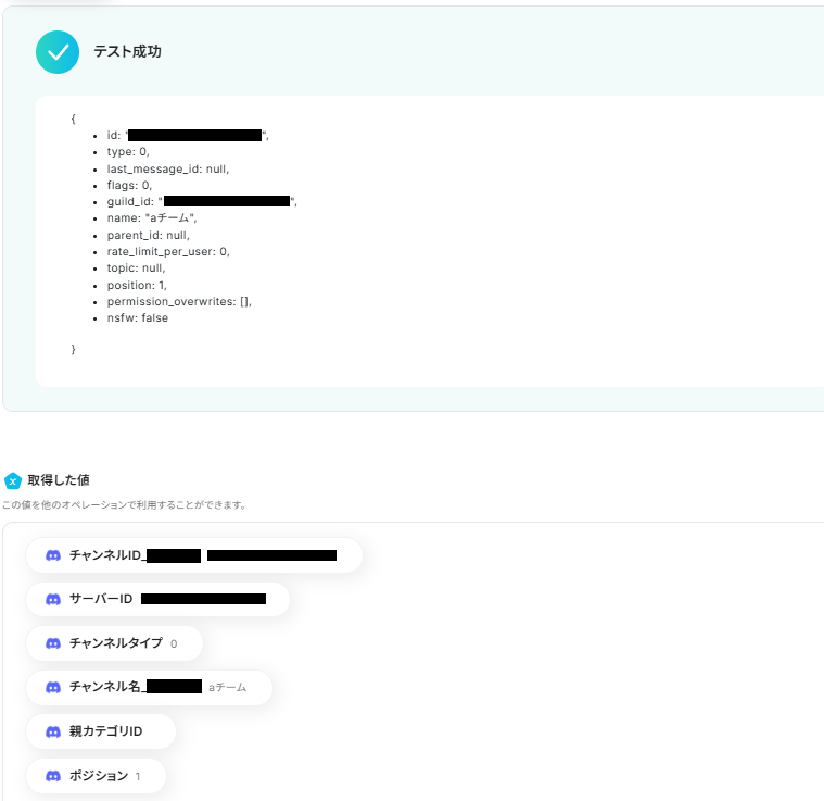 この例では、「ステータス」と「チャンネルID」を更新して、Google スプレッドシートに入力しているチャンネル名でDiscordにチャンネルが作成されたことを通知します。