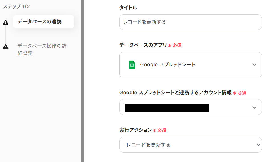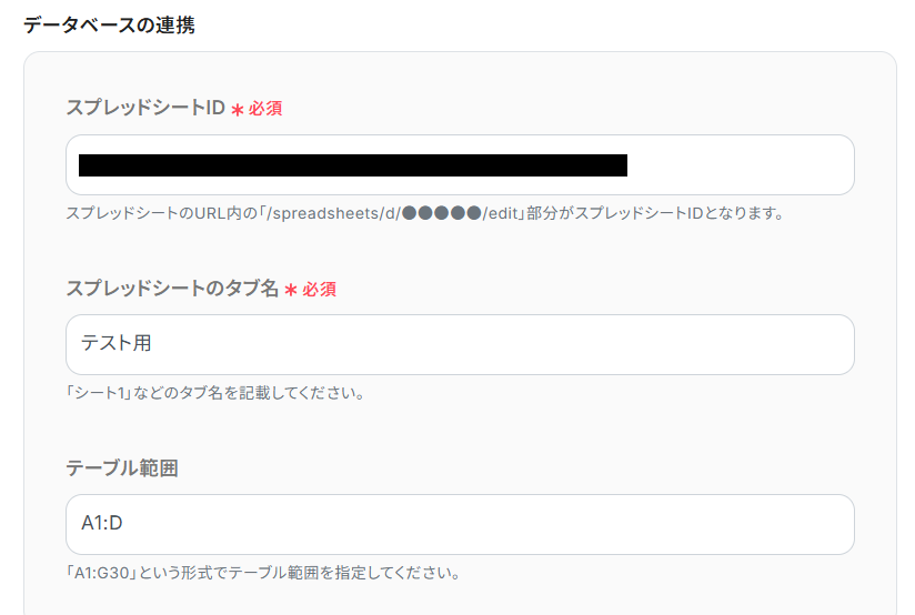 対象のデータベースをGoogle スプレッドシートに用意できたら、以下3つの情報をYoomに設定していきましょう。