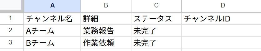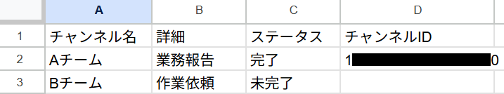 ここで実際に、該当のGoogle スプレッドシートにアクセスしてみます。繰り返し処理の1件目として、「Aチーム」のステータスとチャンネルIDが更新されていますね。