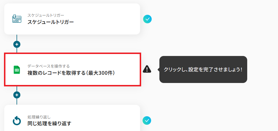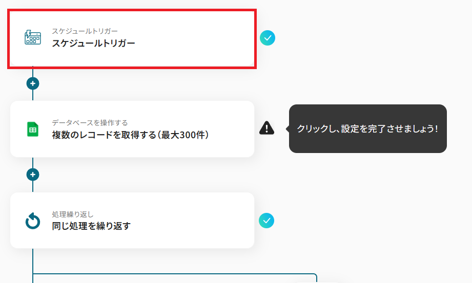 ここで取得した値を設定することにより、スケジュールトリガーで設定した日時になる度に、新しく取得したレコードの一覧情報が更新されて、繰り返し処理の対象になります。