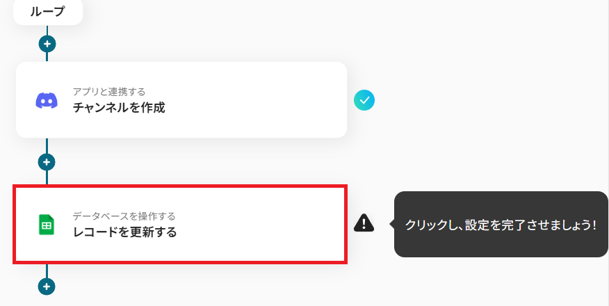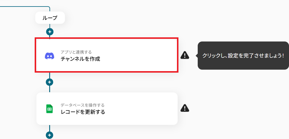 繰り返し処理の後続オペレーションとして、Google スプレッドシートから取得したチャンネル名の数だけ、1件ずつDiscordでチャンネルを作成するループ処理を行います。