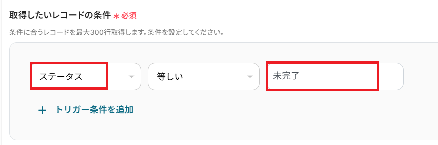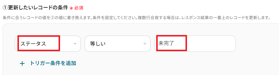 更新したいレコードの条件を設定しましょう。こちらも前のステップと同じ条件で設定します。