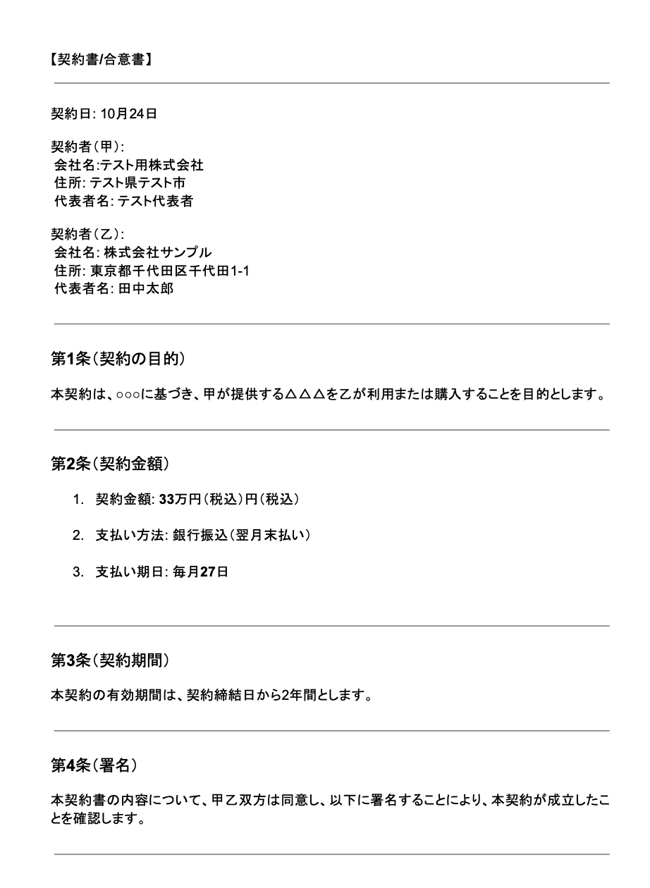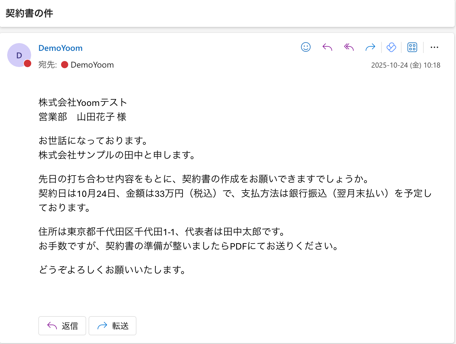 今回はテスト用に、特定の件名「契約書」を含む以下のメールを受信しました。