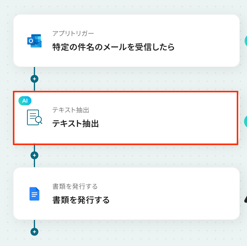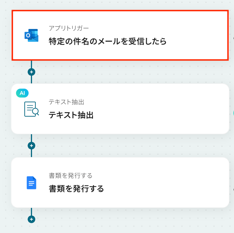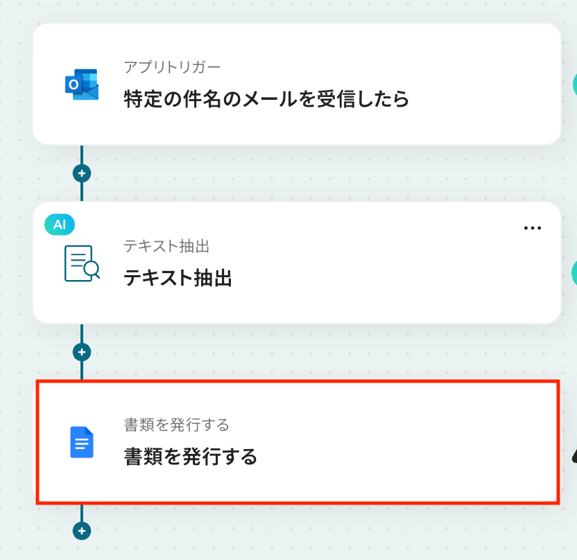 このワークフローを活用すれば、Outlookで特定のメールを受信したことをきっかけに、メール本文の情報をAIが自動で読み取り、Googleドキュメントで書類を発行します