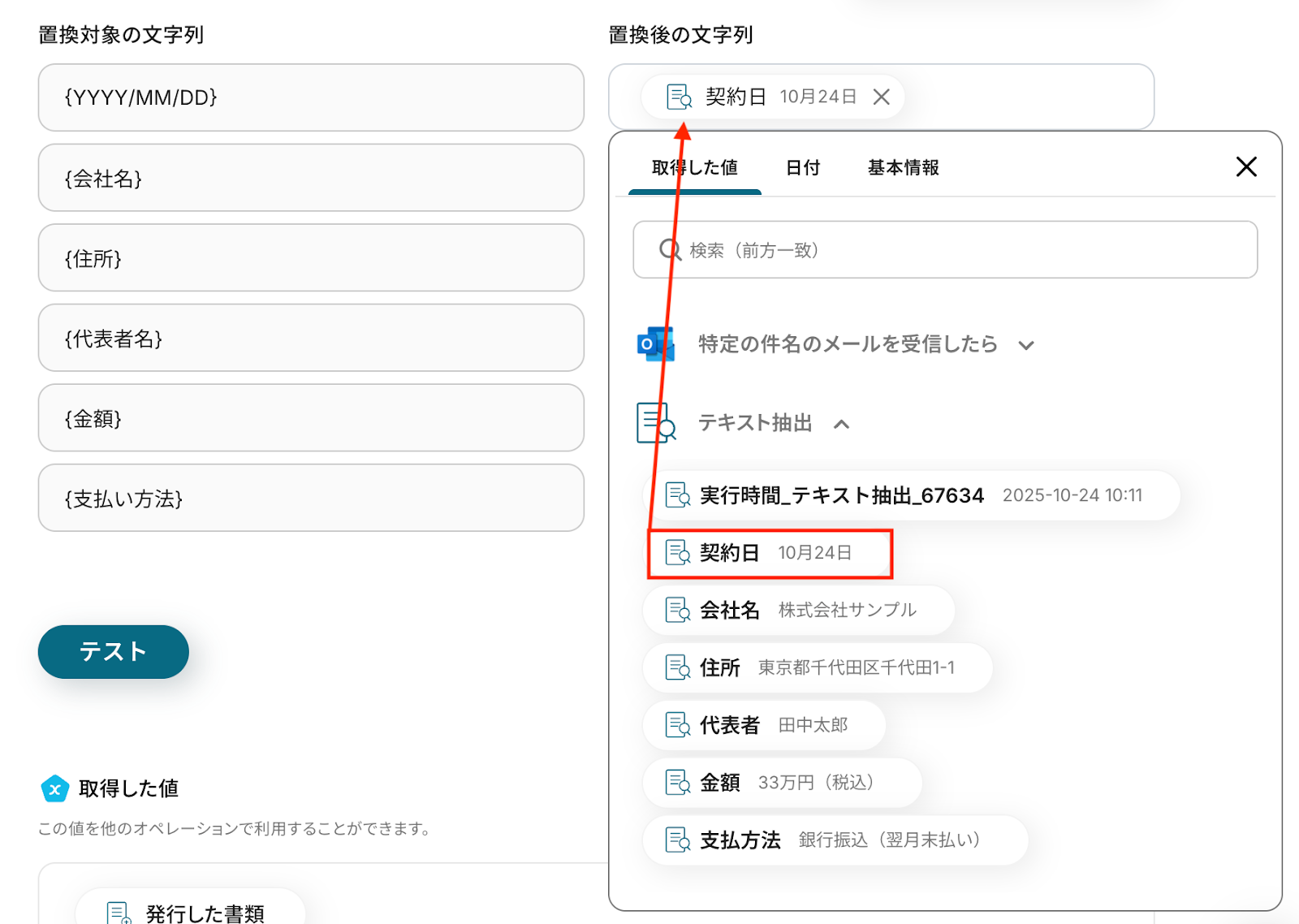 置換後の文字列欄をクリックすると、前のステップでテキストから抽出した値が表示されるので、選択して入力してください。