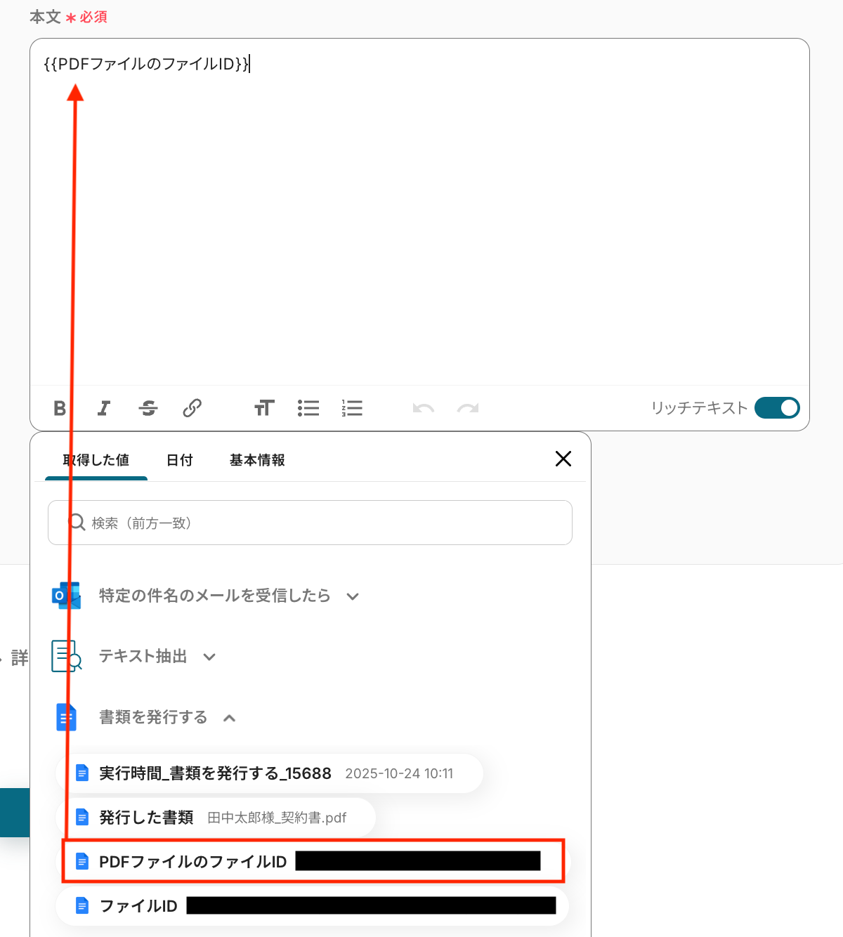 その後、アクション設定画面でGoogleドキュメントから取得したファイルIDなどを指定することで、Gmailの本文にドキュメント情報を含めて送信することが可能です。