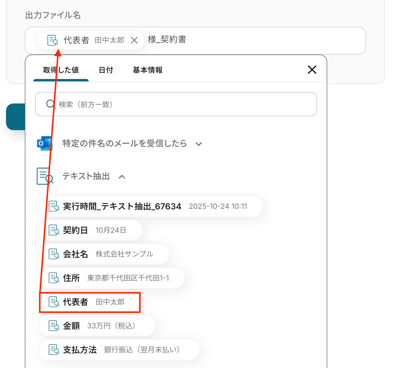 トリガーをONにすることで、Outlookで特定件名のメールを受信したタイミングで、AIによるテキスト抽出が実行され、メール本文から契約日や会社名、金額などの設定した情報が自動で抽出されます。