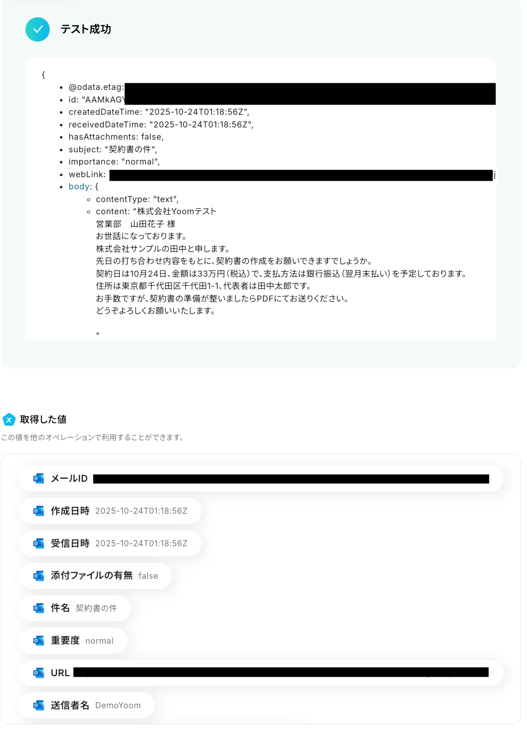 テストに成功すると、Outlookで受信した特定の件名のメールに関する情報が一覧で表示されます。