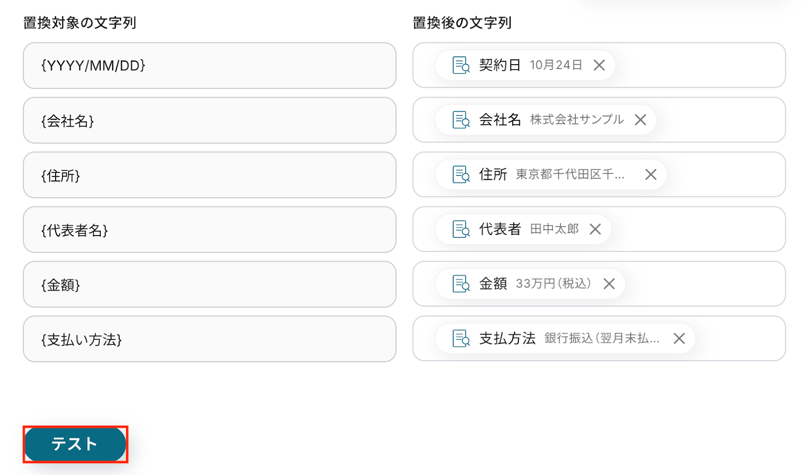 各項目について設定が完了したら、「テスト」をクリックして設定した内容で書類が発行されるか確認しましょう。