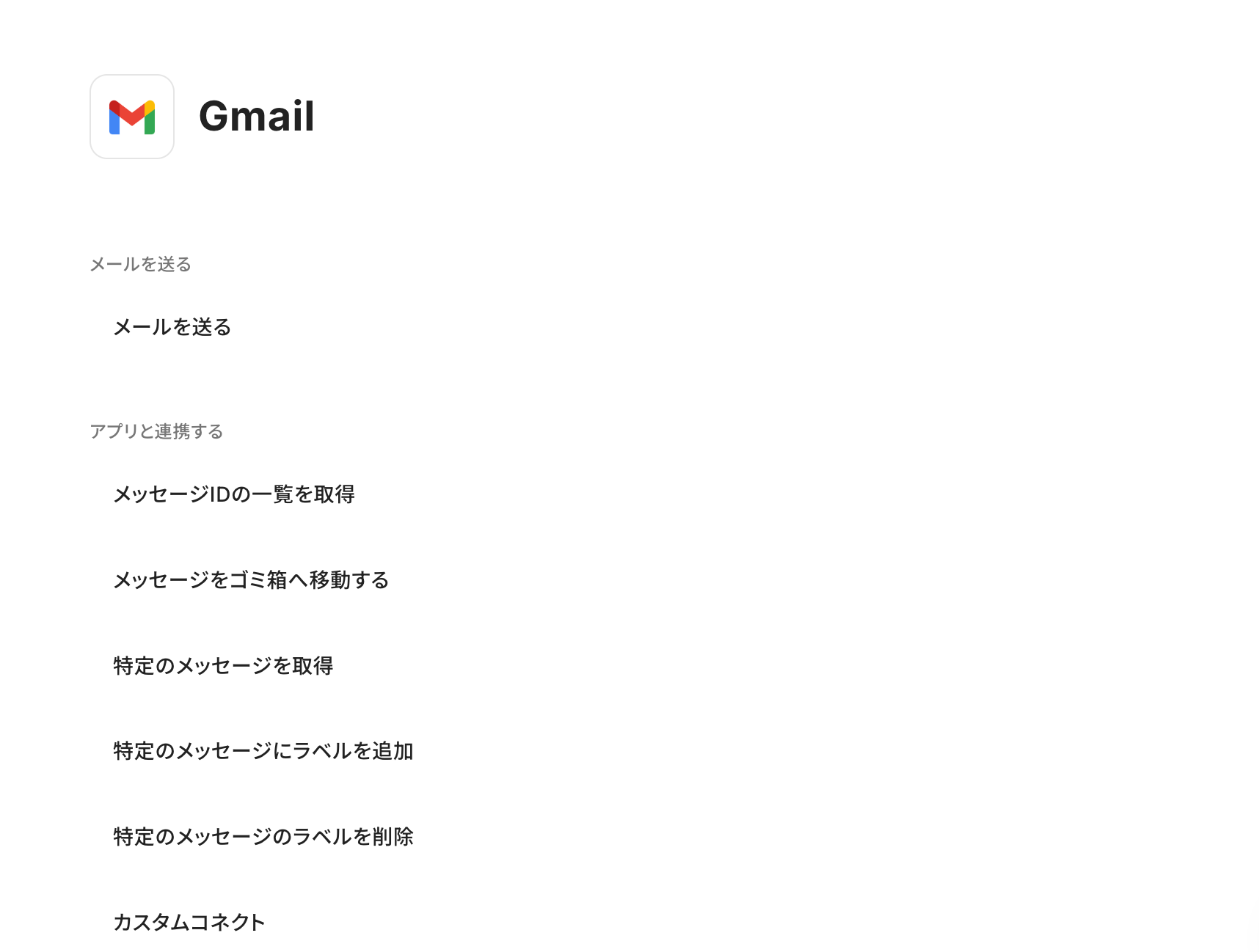 オペレーションタイプの選択からGmailなどのメール系アプリを選択し、表示されるアクション項目から「メールを送る」などのアクションを選択してください。