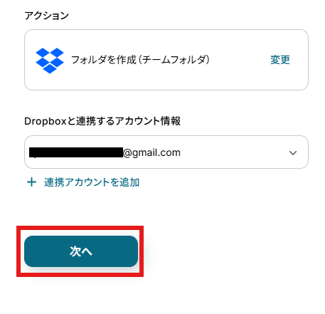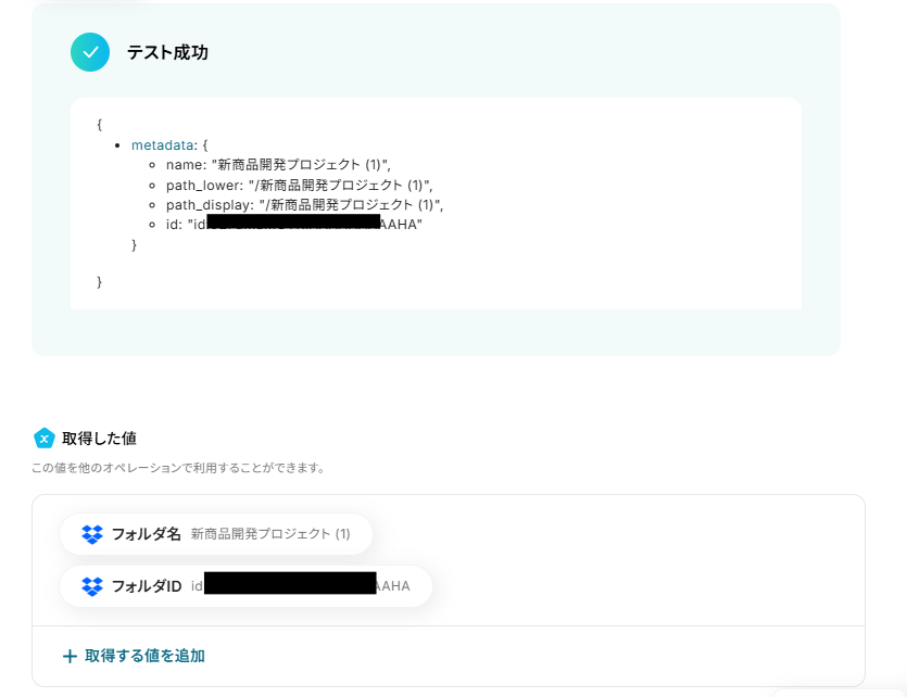 - 最後に、オペレーションでDropboxの「フォルダを作成」アクションを設定し、Asanaのタスク情報を元にしたフォルダが作成されるように設定します