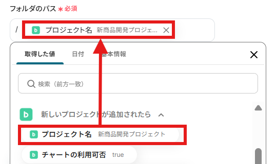 「フォルダのパス」は前段で取得した値から入力してください。