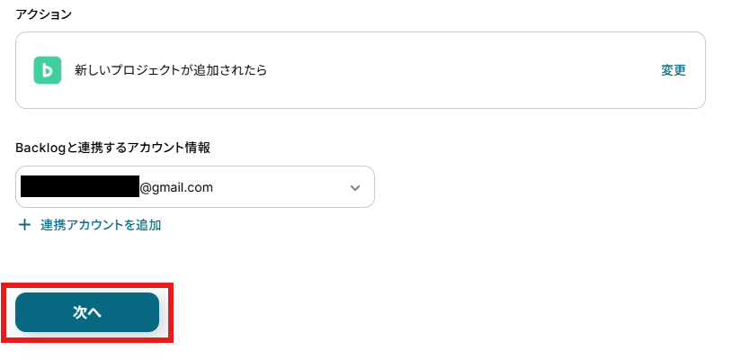 - 次に、トリガーでBacklogを選択し、「新しいプロジェクトが追加されたら」というアクションを設定します