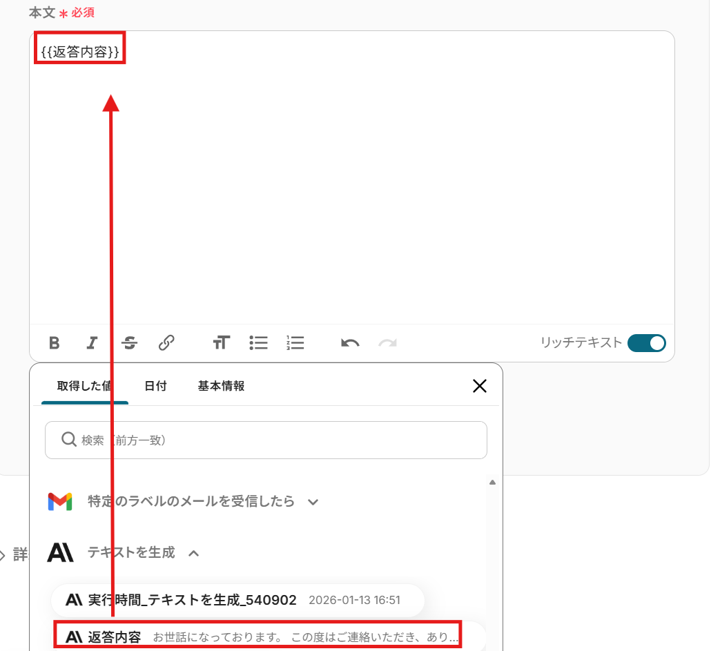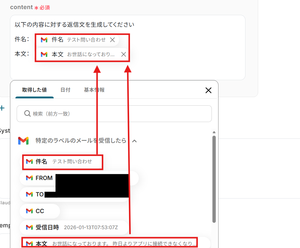 ここでは、受信したメールの情報をもとに、Anthropic(Claude)で返信文を生成します。