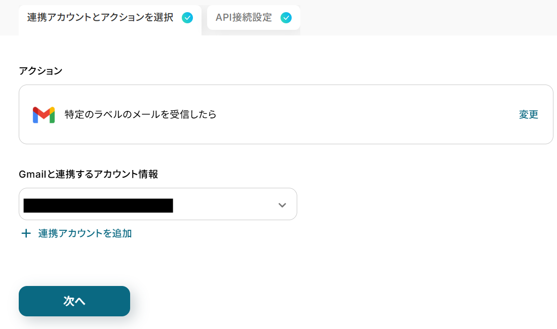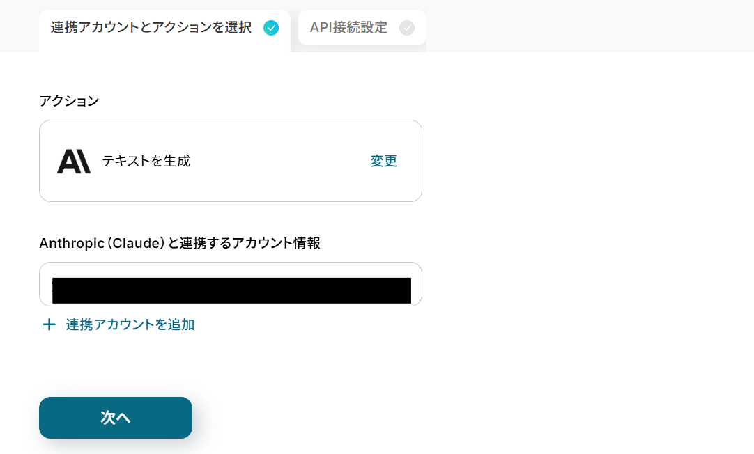 連携するアカウント情報を確認し、アクションはテンプレート通りのまま「次へ」をクリックして進んでください。