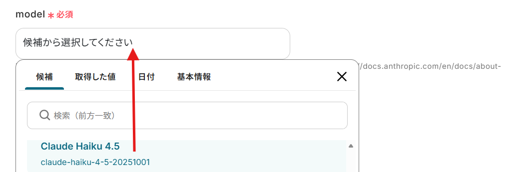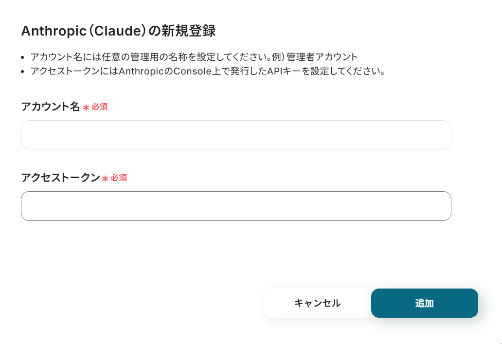 Anthropic(Claude)の連携方法 検索ボックスにAnthropic(Claude)と入力し、Anthropic(Claude)のアイコンをクリックします。 下記の画面になったら、必須項目を入力してください。