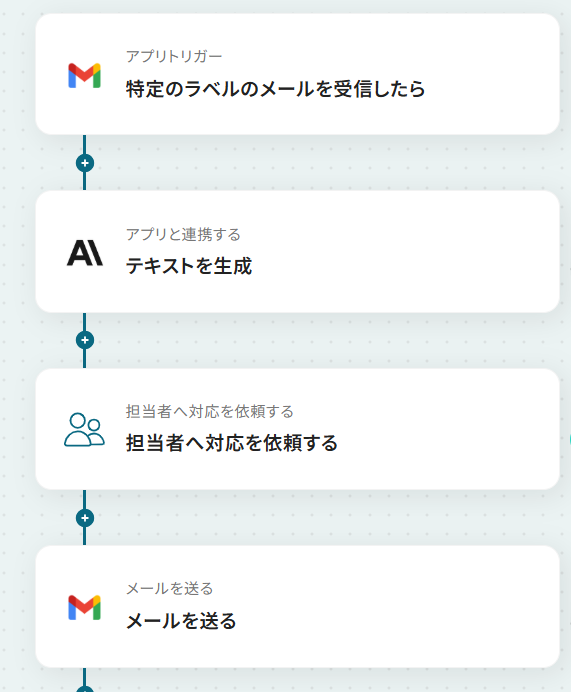 はじめに、GmailとAnthropic(Claude)をYoomと連携します 次に、トリガーでGmailを選択し、「特定のラベルのメールを受信したら」というアクションを設定します 続いて、オペレーションでAnthropic(Claude)の「テキストを生成」アクションを設定し、受信したメール本文を基に返信メールの下書きを作成します 次に、オペレーションで担当者依頼機能の「担当者へ対応を依頼する」アクションを設定し、生成された下書きの承認を依頼します 最後に、オペレーションでGmailの「メールを送る」アクションを設定し、承認された内容でメールを自動送信します ※「トリガー」:フロー起動のきっかけとなるアクション、「オペレーション」:トリガー起動後、フロー内で処理を行うアクション■このワークフローのカスタムポイント