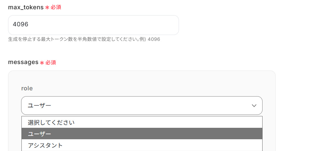 role :プルダウンからユーザー、またはアシスタントのどちらかに設定します。
