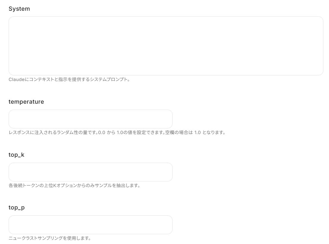 アクセストークン :注釈通りAnthropic(Claude)で発行したAPIキーを設定してください。 ※詳しいAPIキーの取得方法はこちらの公式ホームページ をご覧ください。