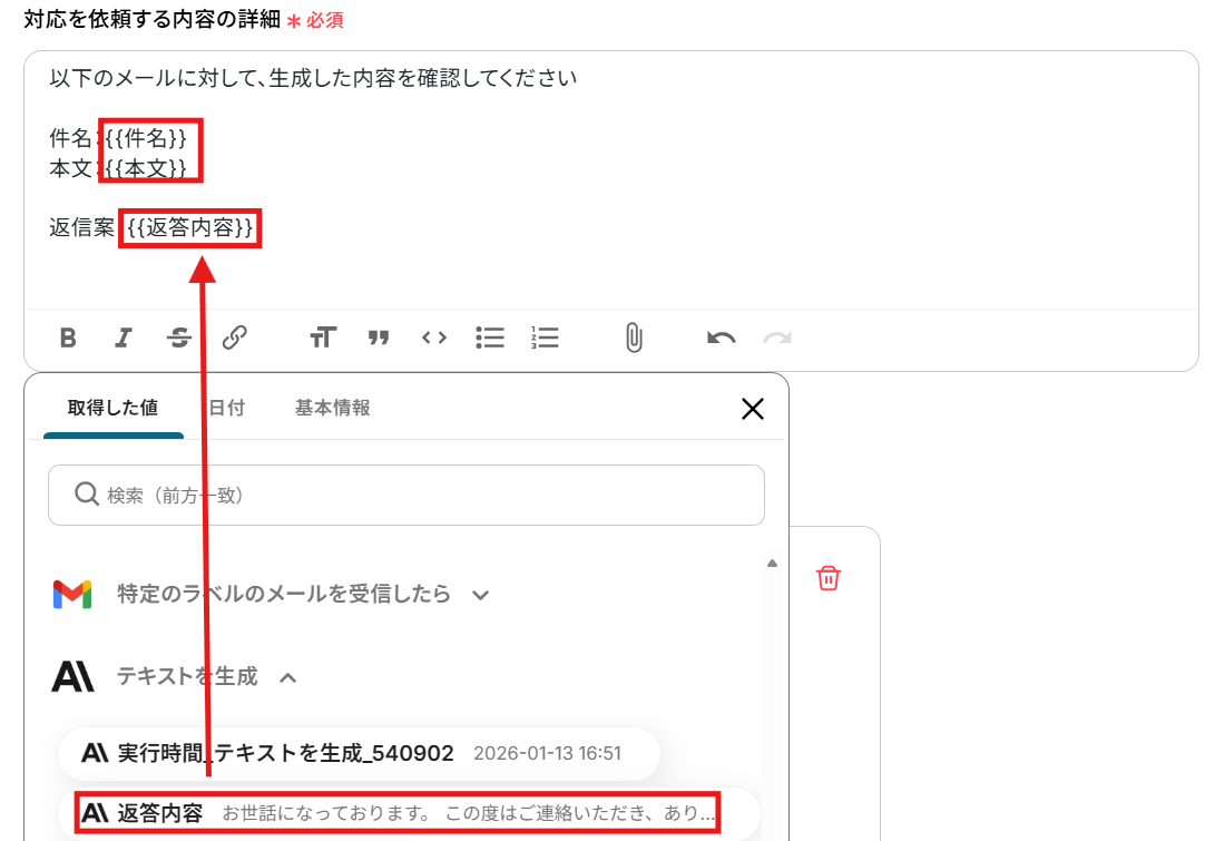 対応を依頼する内容の詳細は、取得した値を利用して下記のように設定しました。 取得した値を利用することで、トリガーが起動するたびに最新の値を自動で引用できます。
