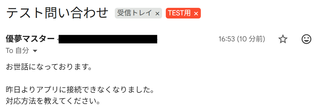 ここでは、具体的なGmailのトリガー条件を設定します。 この後のテスト操作で、特定のラベルに該当するメールを受信している必要があります。 今回はフィルタールールを作成し、下記のメールが「TEST用」というラベルに振り分けられるように設定しました。