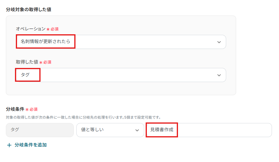 「分岐条件」は、分岐先の処理を行う条件を設定します。