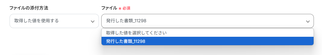 「ファイルの添付方法」は、「取得した値を使用する」を選択して、以下画像のように設定ください。