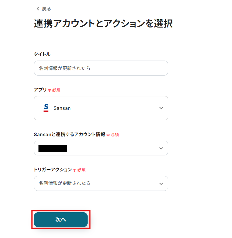 連携するアカウント情報には、ステップ1で連携したアカウント情報が反映されています。トリガーの設定はそのままにして、「次へ」をクリックしてください。