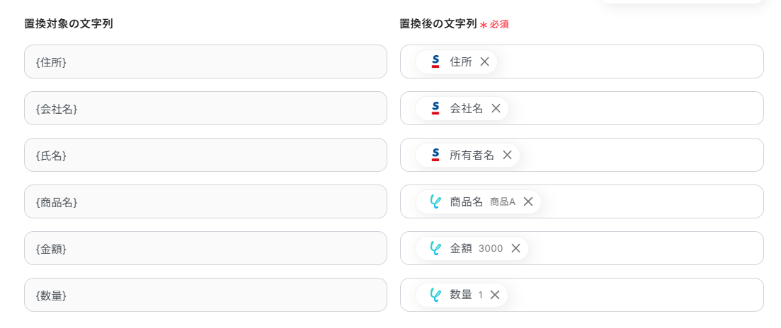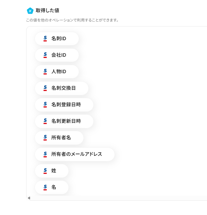 今回、Sansanのアウトプット(取得した値)が空白のため、Sansanのアウトプットから選択した部分が空白ですが、本来は値が入ります。