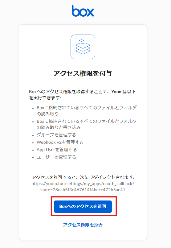 次の画面で、「Boxへのアクセスを許可」をクリックしてください。
