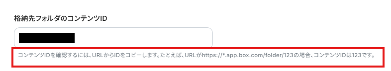 「格納先フォルダのコンテンツID」は、入力欄下の説明に従って、入力してください。