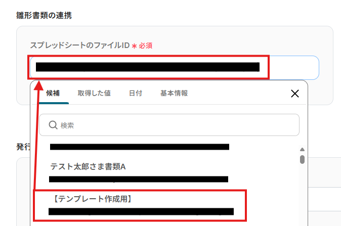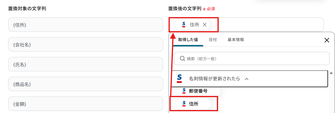 各項目は、入力欄をクリックして表示されるアウトプット(取得した値)から選択してください。