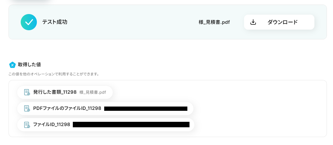アウトプットとは、トリガーやオペレーション設定時に、「テスト」を実行して取得した値のことを指します。