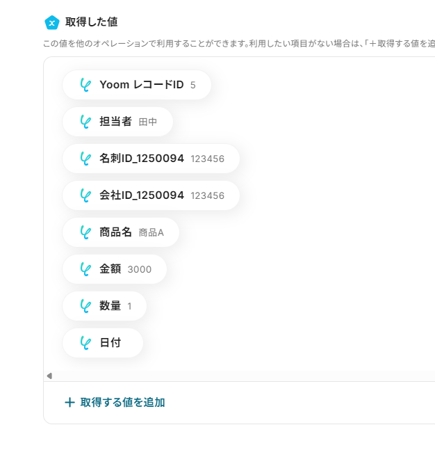 「商品名」「金額」「数量」は、アウトプット(取得した値)の「レコードを取得する」から選択しています。