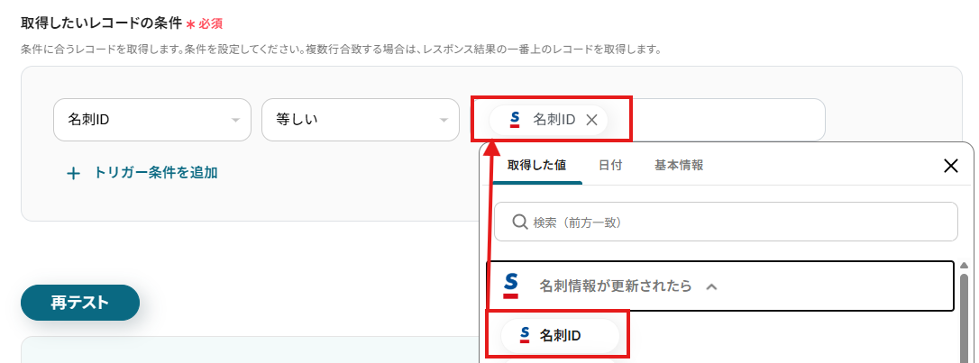 ※左側2項目は、レコードの項目と条件をプルダウンから設定します。右側は、設定したレコードの項目に対応した項目を、取得した値から選択します。