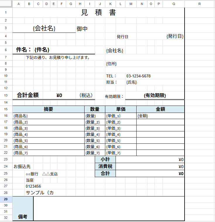 Googleスプレッドシートで、見積書の雛形書類を作成しておきましょう!後続の、見積書発行の設定で必要になります。