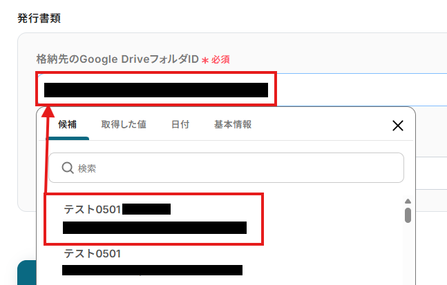 「格納先のGoogle DriveフォルダID」は、発行した書類を格納する場所を設定します。