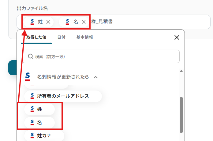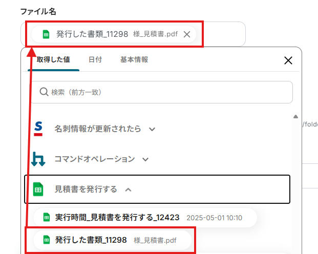 「ファイル名」は、入力欄をクリックして表示されるアウトプット(取得した値)から選択してください。