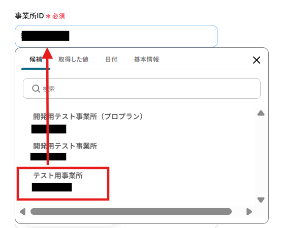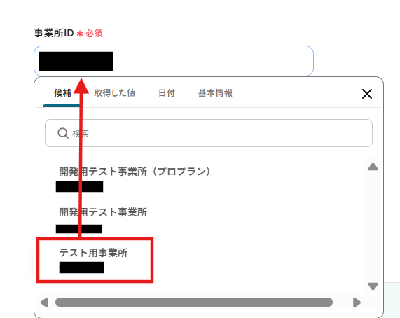3.「事業所ID」を候補から任意の事業所名を選択します。
