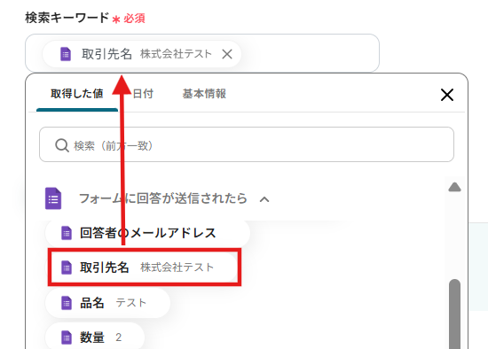 4.「検索キーワード」は、先ほど取得したアウトプットから選択します。