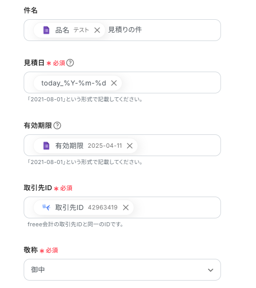 入力フォームに見積もり情報が入力されたら、freee請求書で見積書を発行し、Slackに通知するフローです。