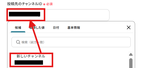 上記「1」の設定が終わったらフローに戻り、投稿を行うチャンネルIDを候補から選択します。