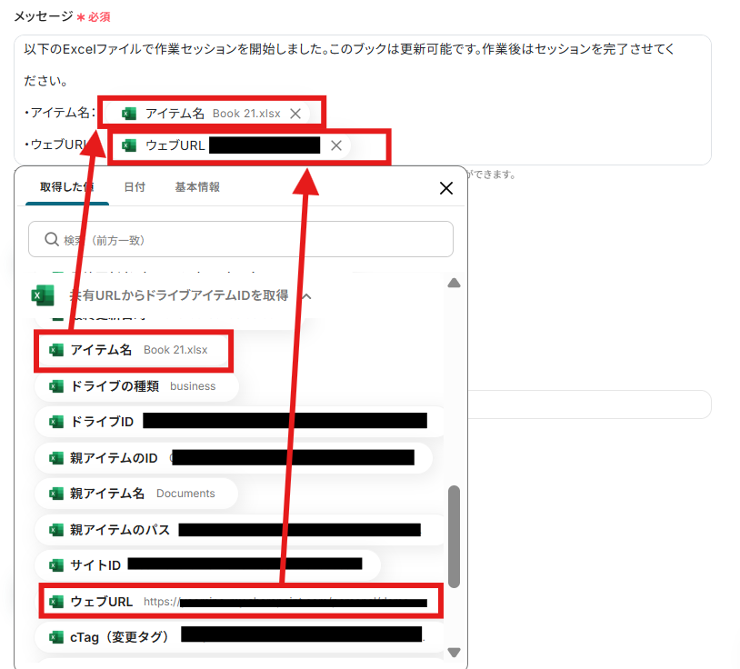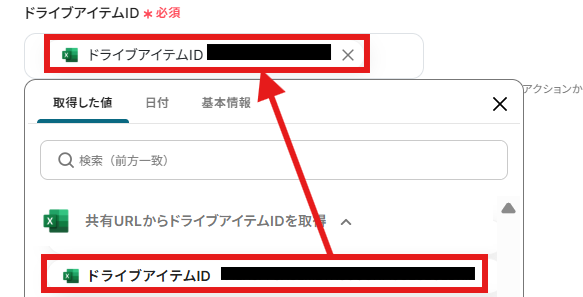 前ステップで取得した値から「ドライブアイテムID」を入力します。 取得した値を活用することで、固定値ではなく、トリガーが実行されるたびに最新の情報が反映できます。
