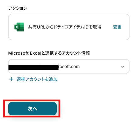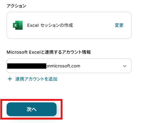 アクションはデフォルト設定のまま、アカウント情報は、連携したいアカウントが選択されているか確認してください。確認が終わったら「次へ」で進みましょう。