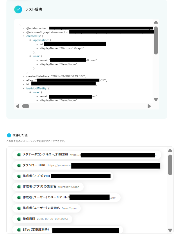※取得した値 とは? トリガーやオペレーション設定時に、「テスト」を実行して取得した値のことを指します。 後続のオペレーション設定時の値として利用でき、フローボットを起動する度に変動した値となります。