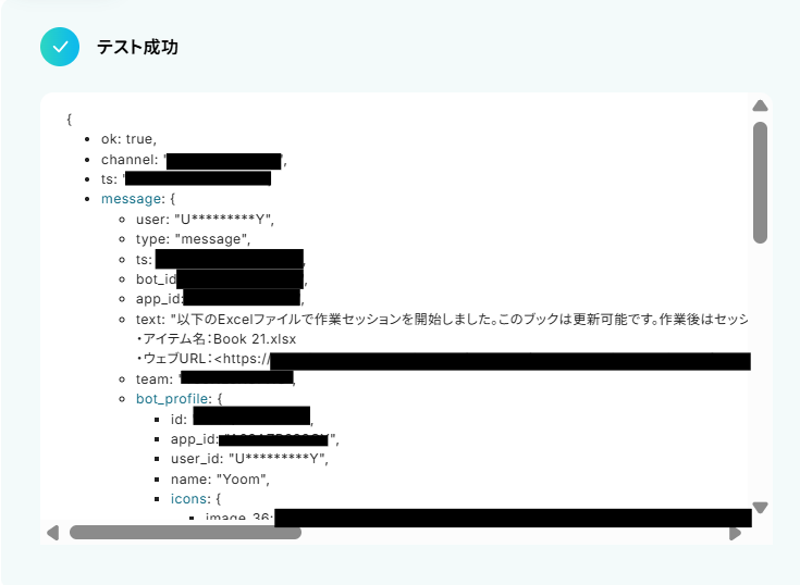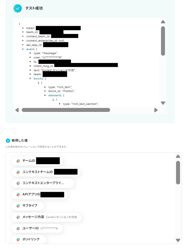 メッセージを投稿したら設定画面に戻り、テストボタンをクリックしてください。 テストが成功すると、取得した値が入ります。 これでSlackに特定のメッセージが投稿されたときにのみトリガーが起動するようになります。