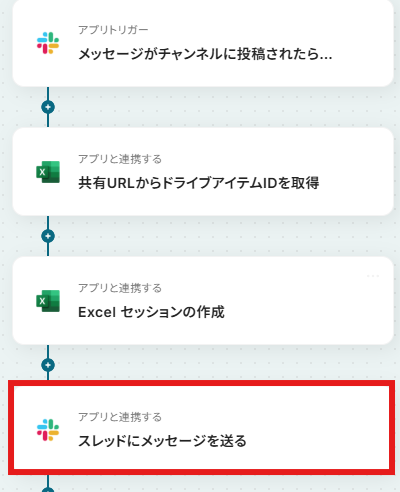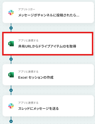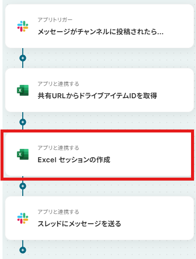 Slackのトリガー設定では、通知を検知したいチャンネルや、特定のキーワードを含むメッセージなどを任意で指定することが可能です。 セッションを作成する対象のMicrosoft Excelファイルは、共有URLを指定することで、任意のものに変更できます。 Slackに送るセッション開始の通知メッセージは、取得したMicrosoft ExcelファイルやセッションIDの情報を含めるなど、任意の内容に設定できます。 ■注意事項