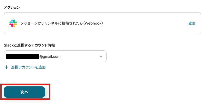 アクションはデフォルト設定のまま、アカウント情報は、連携したいアカウントが選択されているか確認してください。確認出来たら「次へ」をクリックしましょう。