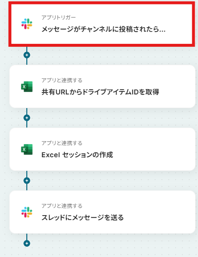Slackの投稿からMicrosoft Excelでセッションを作成するフローを作ってみよう それではここから代表的な例として、Slackで特定のメッセージがチャネルに投稿された際に、Microsoft Excelでセッションを自動で作成するフローを解説していきます!